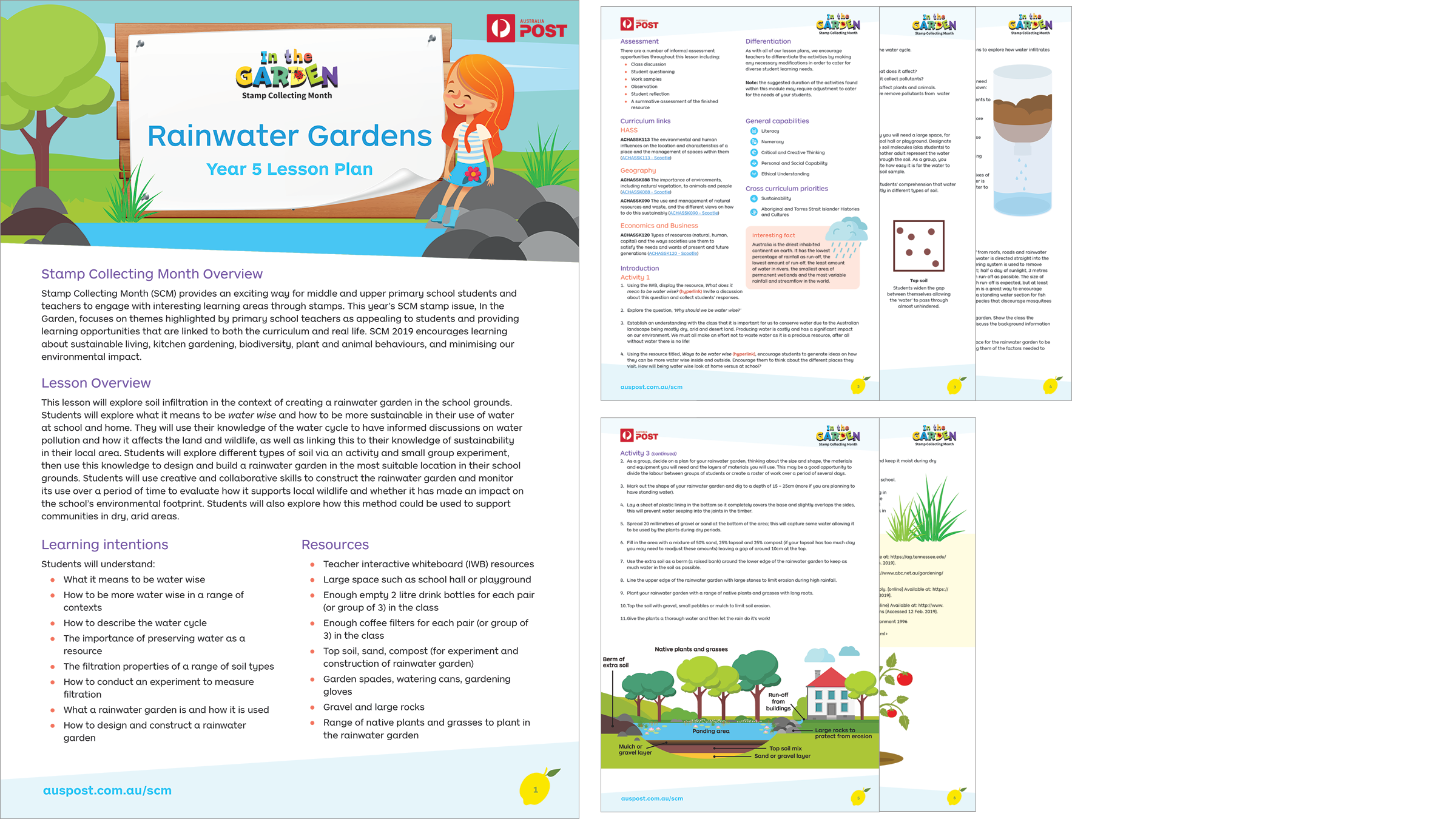 The first stamp in this year’s collection features a rainwater garden. It’s a specifically designed and constructed garden bed that takes rainwater |