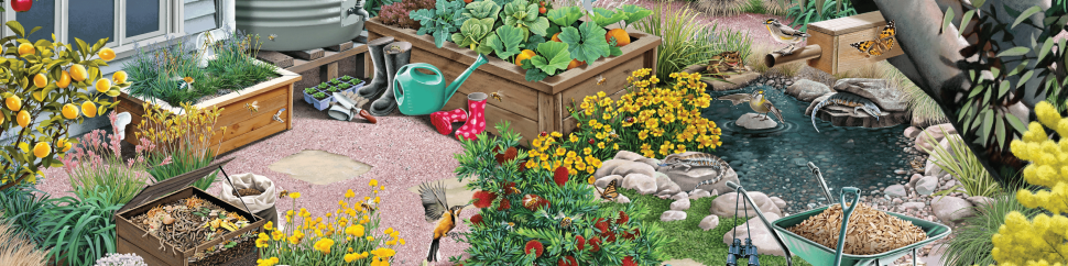 | 0:30 | Our sustainable garden scene is set in a temperate Australian climate. It includes native trees, shrubs and groundcover plants that don’t need a lot of water and which attract helpful birds and insects. |