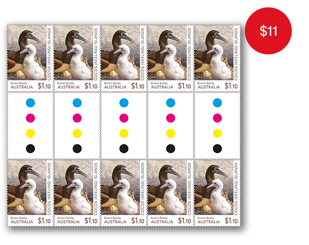 The gutter strip consists of 10 x $1.10 Brown Booby stamps from Cocos (Keeling) Islands: Booby Birds stamp issue.