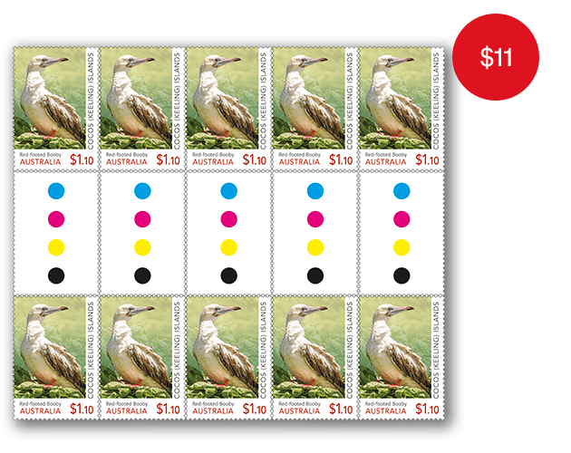 The gutter strip consists of 10 x $1.10 Red-footed Booby stamps from Cocos (Keeling) Islands: Booby Birds stamp issue.