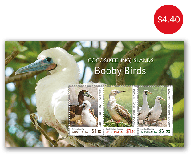 The Cocos (Keeling) Islands: Booby Birds minisheet consists of the three stamps from the issue incorporated into a miniature stamp sheet.