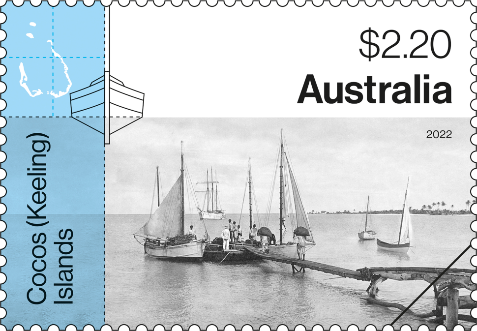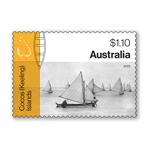The stamp shows jukongs during a social race on the lagoon of Cocos (Keeling) Islands, which sometimes occurred between Home Islanders and the telegraph staff based at the cable station on Direction Island. The stamp photographs are among those taken by engineer Eric E Story and his colleagues during their time on Cocos.