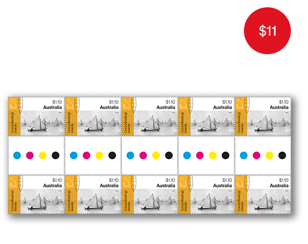 The gutter strip consists of 10 x $1.10 Racing Jukongs stamps from the Cocos (Keeling) Islands: Historical Jukongs stamp issue.