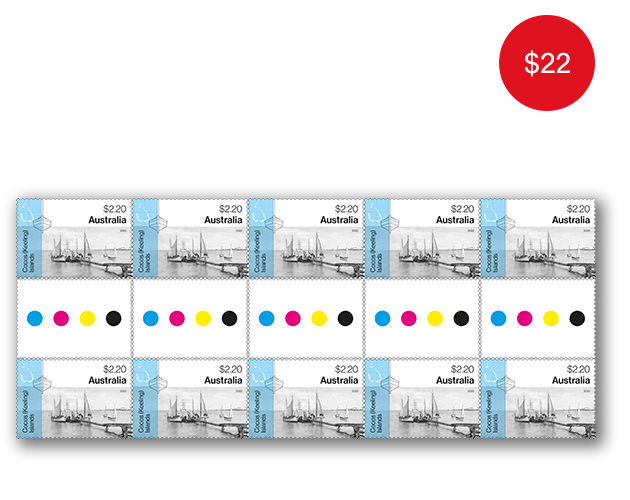 The gutter strip consists of 10 x $2.20 Working Jukongs stamps from the Cocos (Keeling) Islands: Historical Jukongs stamp issue.