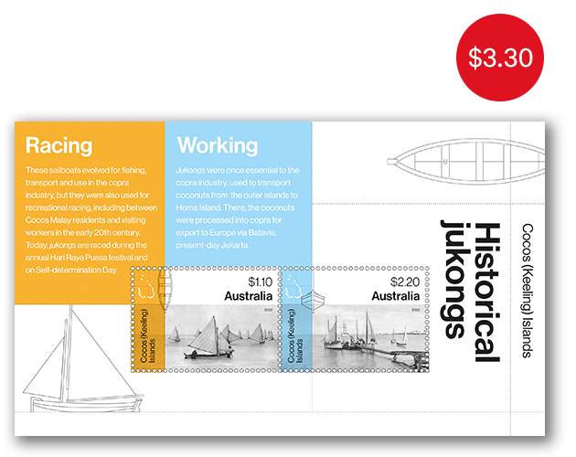 This stamp issue showcases the traditional wooden sailboats of Cocos (Keeling) Islands, known as jukongs (also spelt dukongs). These sailboats were used for fishing, transportation and moving coconuts and copra, the latter a major export industry for the island group.