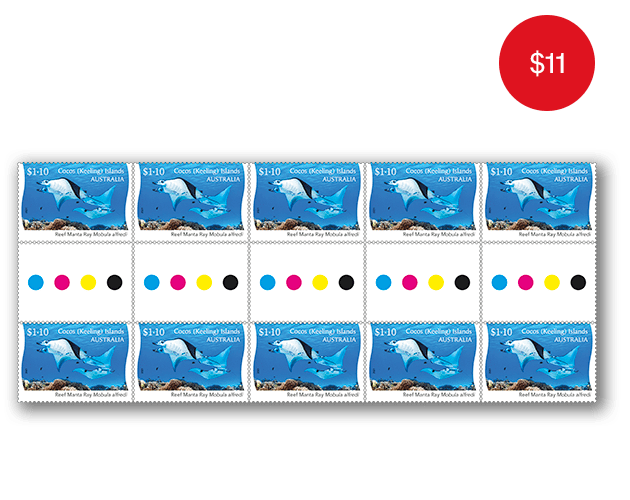 The gutter strip consists of 10 x $1.10 Reef Manta Ray - Ventral View stamps from the Cocos (Keeling) Islands: Reef Manta Ray stamp issue.
