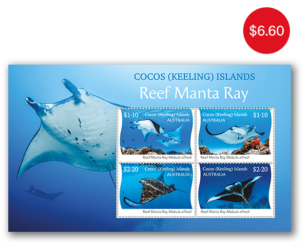 The Cocos (Keeling) Islands: Reef Manta Ray minisheet consists of the four stamps from the issue incorporated into a miniature stamp sheet.