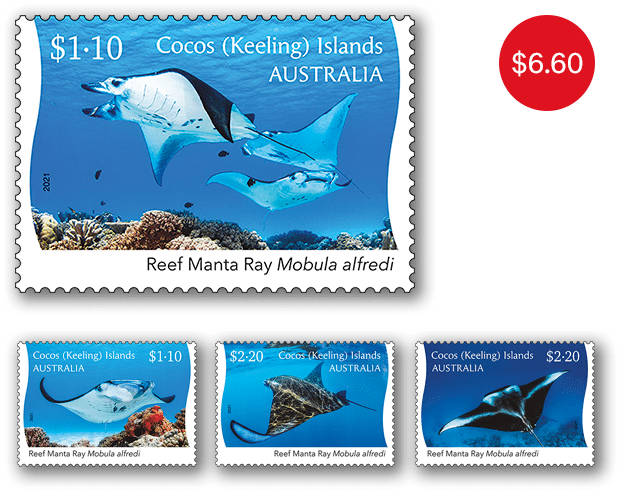 This set of stamps contains all four stamps from the Cocos (Keeling) Islands: Reef Manta Ray stamp issue.