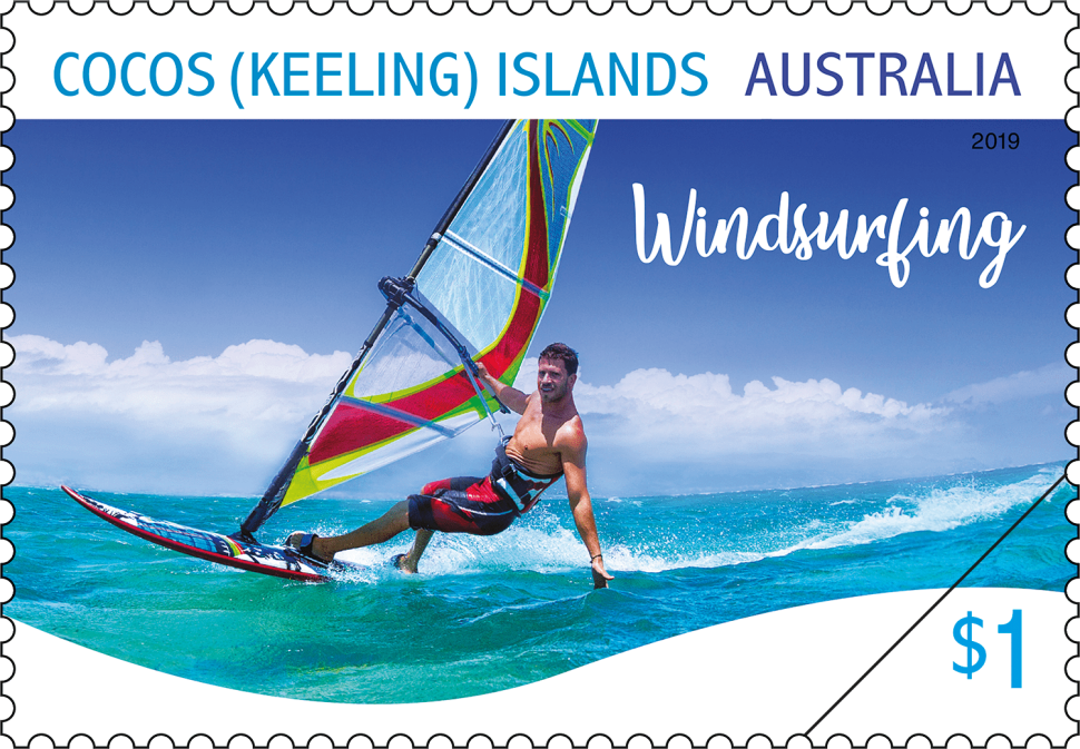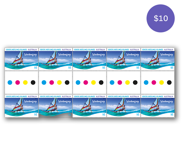 The gutter strip consists of 10 x $1 Windsurfing stamps from the Cocos (Keeling) Islands Water Sports stamp issue, five on either side of the blank strip.