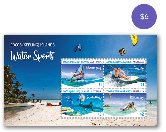 The Cocos (Keeling) Islands Water Sports minisheet consists of the four stamps from the issue incorporated into a miniature stamp sheet.