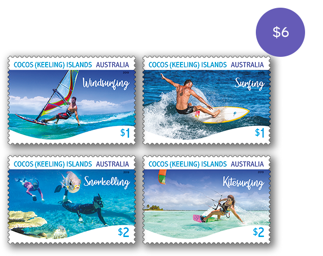 This set of stamps contains all four stamps from the Cocos (Keeling) Islands Water Sports stamp issue.