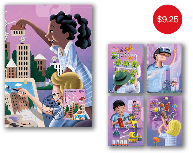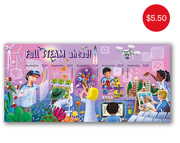 The Full STEAM Ahead minisheet consists of the five stamps from the issue incorporated into a miniature stamp sheet.