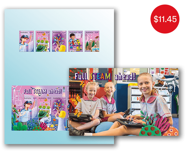 The Full STEAM Ahead stamp pack contains all five stamps and minisheet from the stamp issue presented in high quality folder.